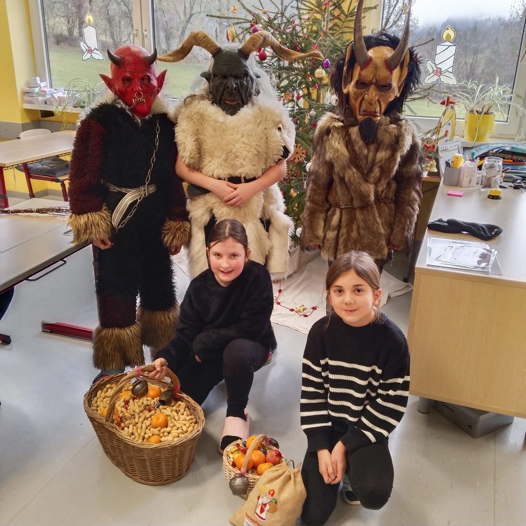 Am Krampustag gab es in unserer Volks- und Mittelschule eine haarsträubende Überraschung. In der letzten Stunde schauten wunderschöne, aber furchterregende Perchten vorbei. Die als Krampusse verkleideten Schüler sorgten für jede Menge Gruselspaß, verteilten Nüsse, Mandarinen und Süßigkeiten und trieben das Böse aus. Eine Riesengaudi für alle Beteiligten!